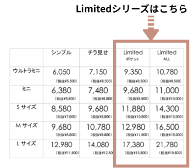 Limitedオールとポケットでは、オーダー方法が少し違いますので、比較してご説明させていただきます。