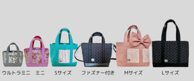 左より ウルトラミニ、ミニサイズ、Sサイズ、ファスナー付きショルダー、Mサイズ、Lサイズ の6種類です。