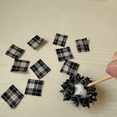 半円型の土台に小さくカットした布を埋め込んでいきます。